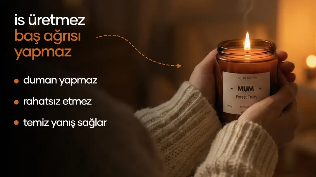 Geleneksel parafin mumlarına göre daha temiz yanar, havayı kirletmez ve uzun süre kalıcı bir koku deneyimi sunar.