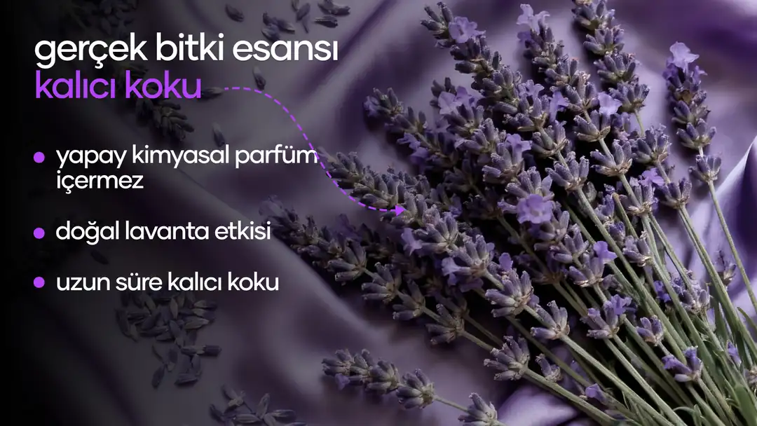 Formülün kalbinde, doğal Akdeniz lavantası özleri bulunur; bu özler, çamaşırlarınızda uzun süre kalıcı, sakinleştirici bir koku bırakır.