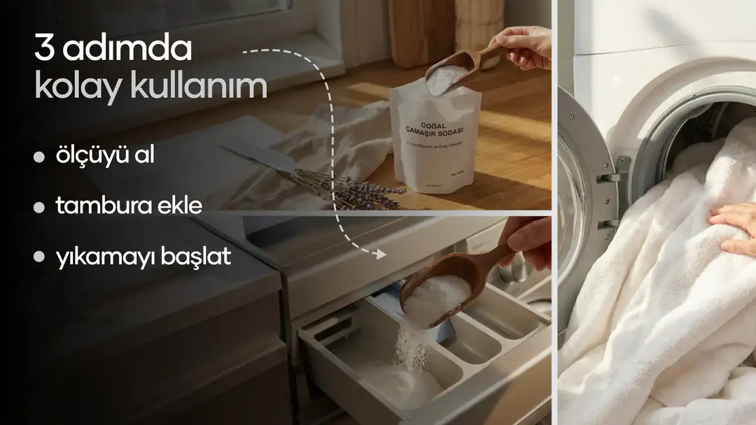 Elde Yıkama: Bir miktar çamaşır sodasını suya ekleyerek elde yıkamada da kullanabilirsiniz; lekelerin çözülmesine yardımcı olur.