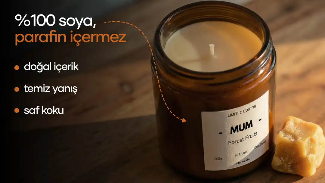 Evinizi sadece aydınlatmakla kalmayan, aynı zamanda doğallık ve huzur yayan bir deneyim arıyorsanız chamashir’in doğal soya mumları tam size göre. Orman meyveli kokulu bu el yapımı mum, bulunduğu her ortamda fark yaratır.